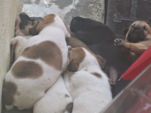 Not wanting for her to repeat the last “drain” experience, we decided to tempt her by preparing a suitable “birthing room” in the little space behind our house. At first suspicious and unused to an enclosed place, she would dart in and out..., but this dog could read our minds! Her belly soon almost like a basketball and nearing term, but we still unsure where she would have the pups. Then one morning we heard the little cries of the newborns… and we felt like proud parents. Six brand new puppies (so so tiny like hamsters), one didn’t make it, but the rest were OK. We pampered them with all the best foods ( loved the raw eggs ) and now wondered what-to-do with these pups.